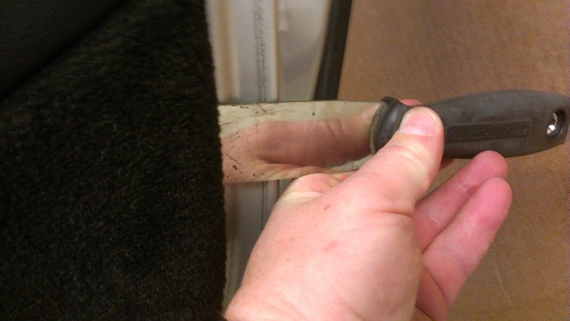 Using a stout (thick) blade scraper shove it carefully under the door panel a few inches then begin to start prying the panel off the door. You may have to move it around to get it closer to the plastic fastener but you have to get a bit aggressive with it. If you are worried about scratching things get some BLUE tape and wrap up the 'Pry Bar'.