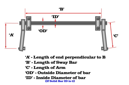 Trying to get a rough idea of the spring rate of your sway bar? This simple calculator will help do that for SOLID and HOLLOW sway bars. It will calculate the spring rate for solid and hallow sway bars. The original formula is from Fred Puhn's book on handling called "How to make your car handle". The formula is a general attempt to compute the spring rate of the sway bar. This can be used for comparison of different diameter bars. See Fred's book for more information on how the front and rear sway bar rates affect the handling.